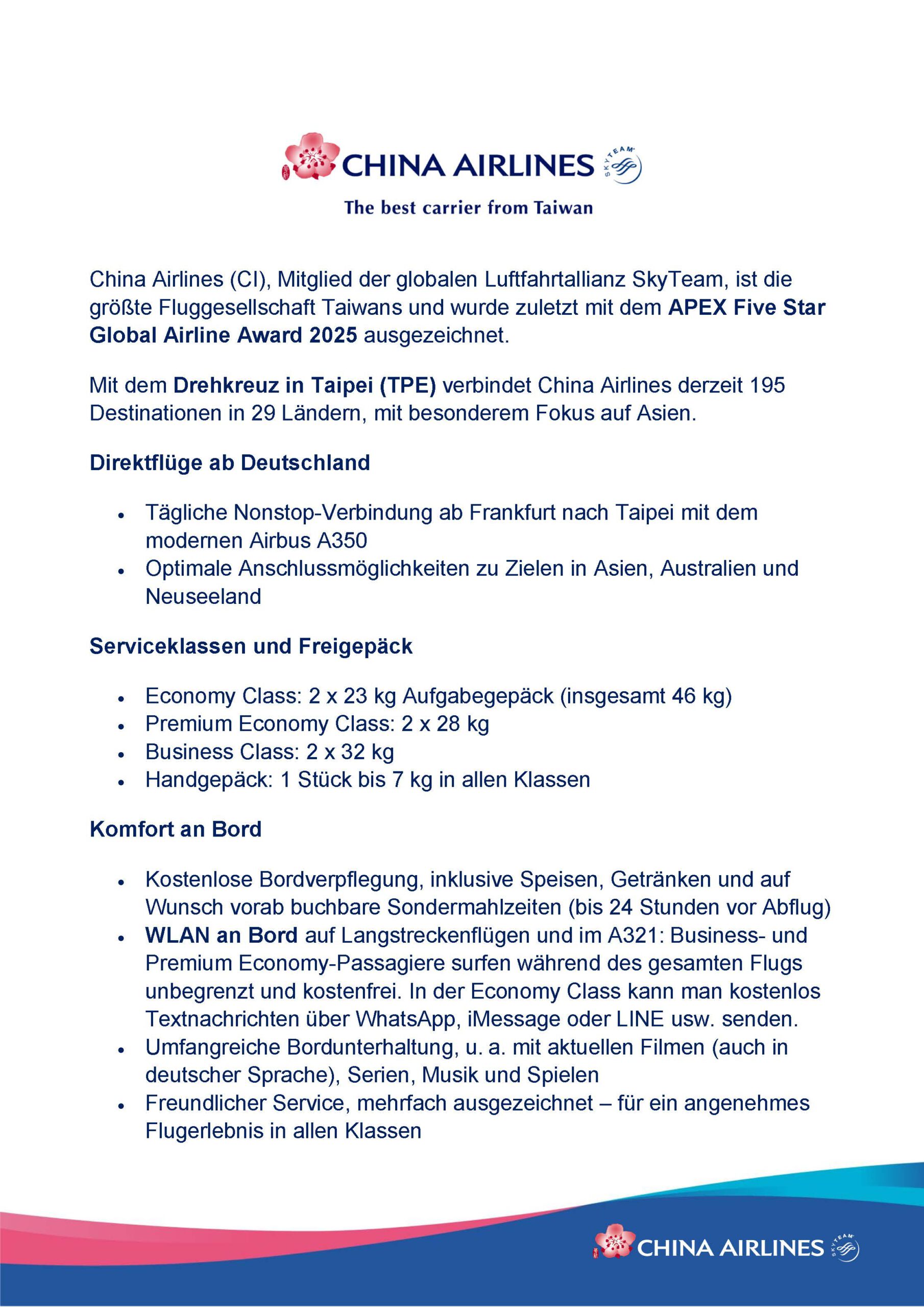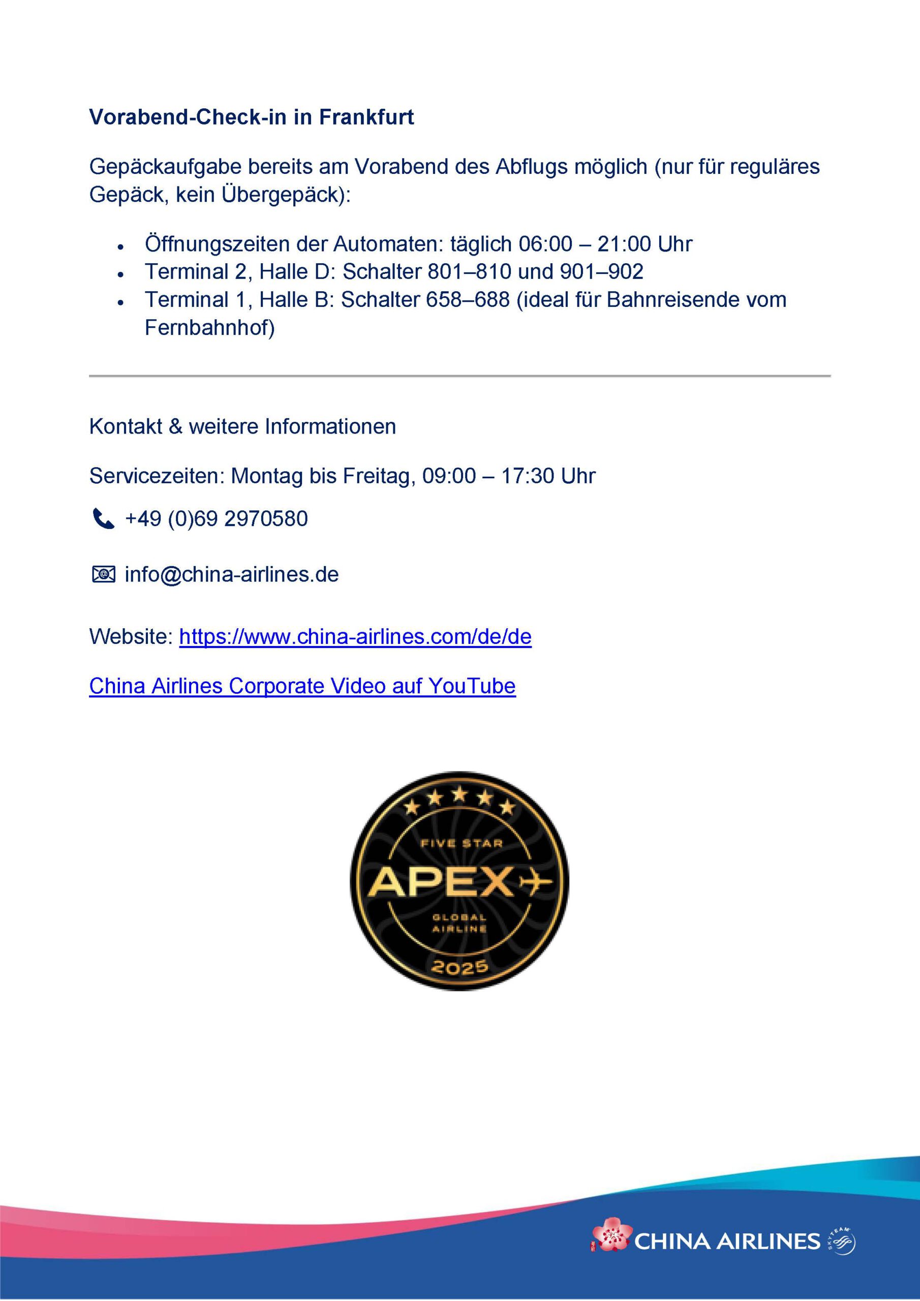 Für Airlines wie China-Airlines, Cathay Pacific, Singapore Airlines und Qatar Airways besteht die Möglichkeit, langfristige Reservierungen vorzunehmen. Dies grarantiert sich einen günstigen Tarife zu sichern oder eine größere Auswahl an verfügbaren Flügen zu finden.